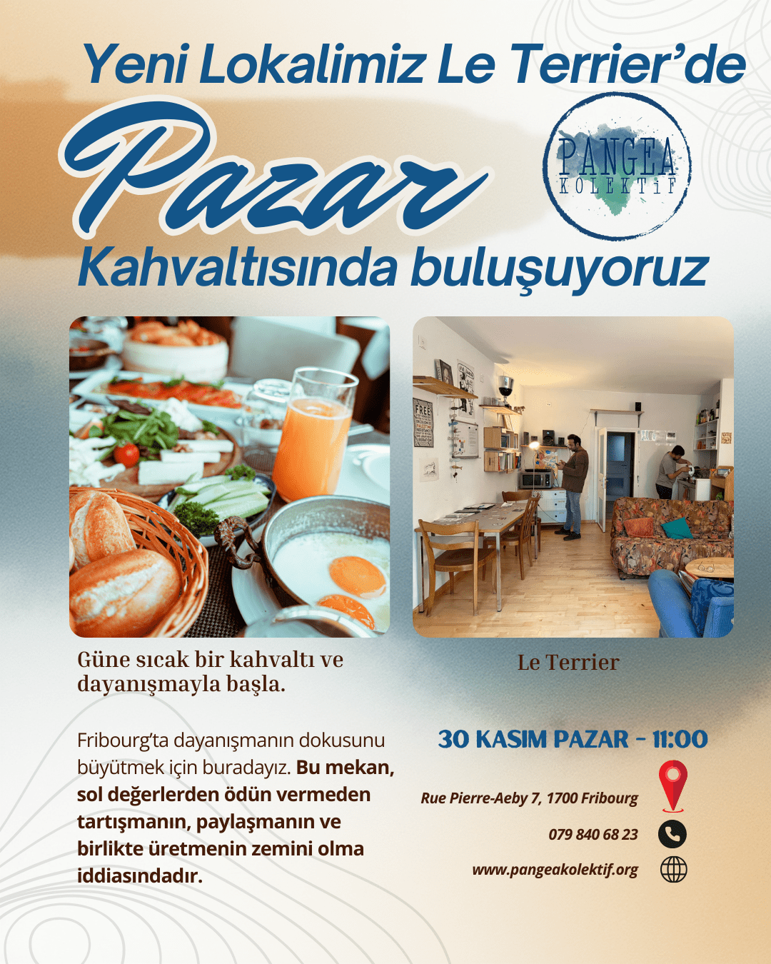 PangeaKolektif olarak Fribourg’da yaşayan göçmenler için planladığımız büyük pikniği hava durumunun yağmurlu olması nedeniyle 1 hafta erteledik.